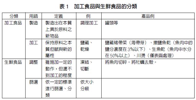 新的食品标示法有许多重大变更,首先,该法重新定义了何谓“生鲜食品”及“加工食品”。在新的定义下,仅经“筛选”或“调整(如冻结、切断)”的产品视为“生鲜食品”,经“制造”或“加工”的产品视为“加工食品”。