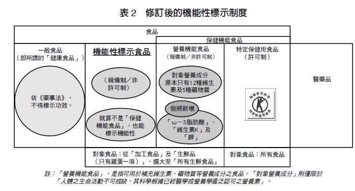 “机能性标示食品”不像“特定保健用食品”必须取得主管单位的核准,也不像“营养机能食品”仅能标示限定的营养成分,只要业者能提出相关的研究论文等作为左证,就算未实施人体实验,也能在提出报备后标示,但业者仍须负起相应的责任。其对象食品相当广泛,涵盖生鲜品在内的所有食品(但不包括含酒精饮料、会导致消费者过度摄取钠或糖分的食品)。