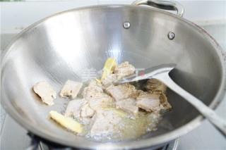2、锅里加油下姜爆香,将冷肉末改刀下锅煎炒出味。