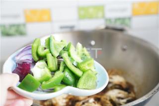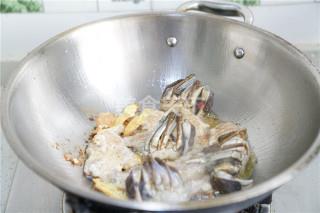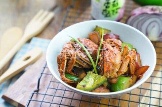 8、焖蟹至熟后再将洋葱及菜椒下锅爆炒一下即可。