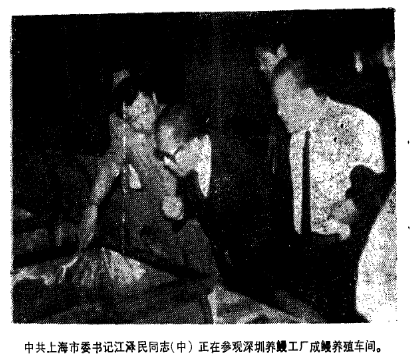这一新型工厂吸引了鳗苗主产区的上海市主政官员的重视。1988年1月14日,时任上海市委书记江泽民同志亲自率学习考察团赴深圳养鳗工厂参观,细致调研成鳗养殖车间、计算机水质监测系统、鼓风冲气和水质预处理机房等关键技术环节,对我方科技人员能在短时期内掌握这一复杂的生物系统工程技术并有所改进和创新表示高度赞赏。