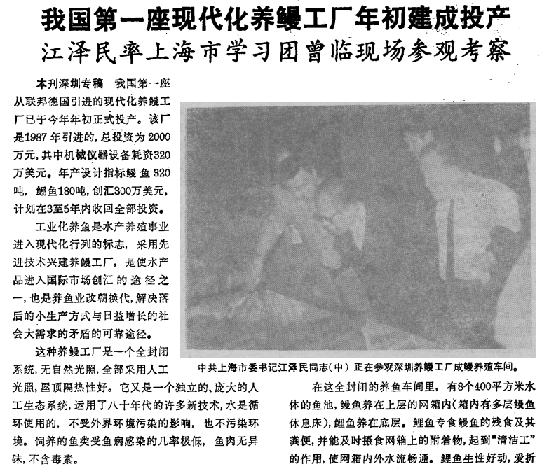 ▲《我国第一座现代化养鳗工厂年初建成投产江泽民率上海市学习团曾临现场参观考察》原文
