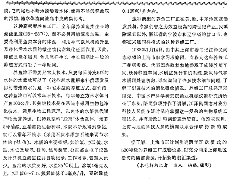 1. 《我国第一座现代化养鳗工厂年初建成投产江泽民率上海市学习团曾临现场参观考察》(发表在《渔业机械仪器》1988年05期)